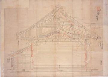 | Keywords: Edo Castle Nishinomaru pic 03.jpg Example of a doorway at the Nishinomaru Palace of Edo Castle The details of the measurements are given in the drawing such as the width between the pillars being approximately 8 m height of the eaves is approximately 5 m 江戸西丸仮御殿御玄関御正 建 割但十分 ノ割 甲良筑前棟全控 元治度 写 請求記号: 6171-32 http //www library metro tokyo jp/17/024/17300 html 1864 unknown pd-art Nishinomaru Edo Castle | ||||
