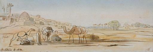 | Keywords: Edward Lear - Belbeis - Google Art Project (2294685).jpg inscribed in brown ink lower left Belbeis 7 AM in brown ink over graphite lower right 6 ; Verso in graphite upper left 169 up ; in graphite center next below top ; in graphite upper right 350 Not on View Watercolor with pen in brown ink over graphite on medium slightly textured blued white wove paper sky camels mammals palm trees sand domes hills trees buildings robes figures representations genre subject landscape special url_id qAGv75_5Qierag PD-old-100-1923 1888 Egypt by Edward Lear Google Art Project works by Edward Lear Bilbeis |