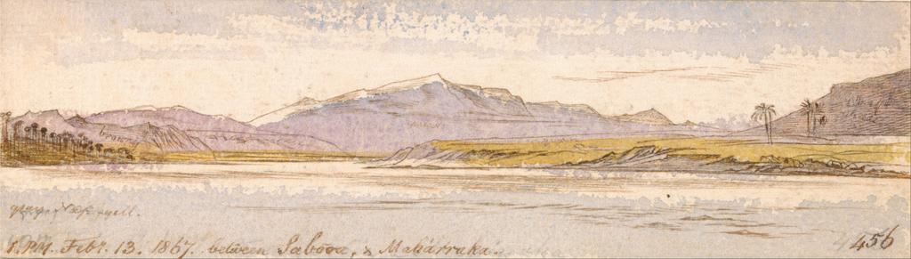 | Keywords: Edward Lear - Between Sabooa & Maharraka - Google Art Project.jpg inscribed in brown ink lower left 1 PM Feby 13 1867 between Sabooa Maharraka ; in brown ink lower right 456 Not on View Watercolor witih pen in brown ink over graphite on moderately thick rough wove paper mounted on thick slightly textured cream wove paper sky palm trees water lake river mountains genre subject landscape special url_id awE8LsBThWNNDQ PD-old-100-1923 1888 Egypt by Edward Lear Nile in art Google Art Project works by Edward Lear Maharraqa Wadi es-Sebua |