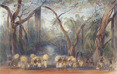 | Keywords: Edward Lear - Coolies on the Road near Kalicut, Malabar - Google Art Project.jpg Not on View Watercolor with body color and gum arabic on wove paper on medium moderately textured cream wove paper vegetation trees figures representations landscape jungle special url_id YQHdRDsLa3dFYw PD-old-100-1923 1888 Google Art Project works in Yale Center for British Art Google Art Project works by Edward Lear Coolies in India 1820s paintings from India Landscape paintings of India Kerala in the 1820s Servants in art of India |