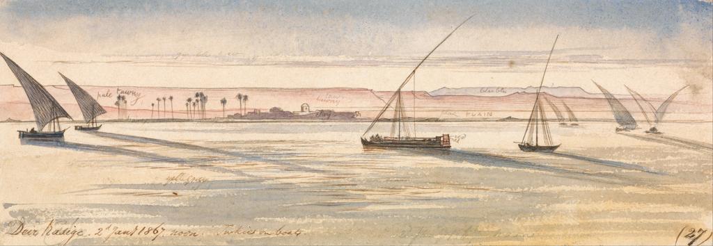 Keywords: Edward Lear - Deir Kadige, noon., January 2, 1867 (27) - Google Art Project.jpg inscribed in brown ink lower left Deir Kadige 2nd Jany 1867 noon Turkies on boats ; in brown ink lower right 27 ; Verso in graphite center 5 up next above lowest Not on View Watercolor with pen in brown ink over graphite on moderately thick slightly textured cream wove paper palm trees water river sails marine art boats special url_id sAGlodFObxE-tA PD-old-100-1923 1888 Egypt by Edward Lear Google Art Project works by Edward Lear Egyptian feluccas in art