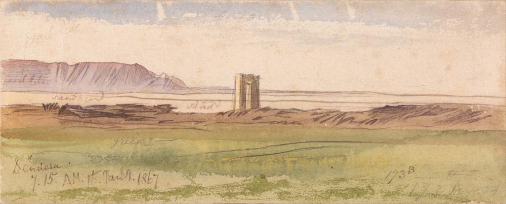 | Keywords: Edward Lear - Dendera - Google Art Project (dwF2VHjrgbVLIQ).jpg commons artist commons date commons medium commons dimensions commons institution Institution Yale Center for British Art commons location commons references commons object_history commons exhibition_history commons credit_line commons inscriptions commons notes commons accession_number commons source commons permission commons other_versions commons zoom core title Dendera core date dateCreated 1867 core location locationCreated San Remo core format w17 3 x h7 cm core provenance Yale Center for British Art Gift of Donald C Gallup BA 1934 PhD 1939 core type landscape core relation http //collections britishart yale edu/vufind/Record/1669408 core format medium Watercolor with pen in brown ink over graphite on medium slightly textured wove paper mounted on thick slightly textured cream wove paper art artist_birth_place London art artist_nationality British art artist_death_place San Remo art artist_date 1812/1888 c-02ada1cb customtext subject sky temple ruins river riverbank landscape desert c-02ada1cb customtext location Not on View c-02ada1cb customtext inscription inscribed in purple ink lower left Dendera 7 15 AM 16 Jany 1867 ; in purple ink lowr right 173B ; Verso in graphite upper left 147 ; in graphite upper center 141 ; in graphite lower right 188 c-02ada1cb creator artist Edward Lear google display_date 1867 google is_artproject TRUE google is_gigapixel FALSE google is_secured TRUE google partner/id 0000000002ada1cb google picasa_token _rZCuiDeIqmvzjM31Wj8YsxFn38 special url_id dwF2VHjrgbVLIQ google partner/name Yale Center for British Art special partner/name_no_lang Yale Center for British Art PD-old-100-1923 1888 Egypt by Edward Lear Google Art Project works by Edward Lear Dendera |