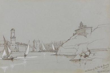 | Keywords: Edward Lear - Entrance to the Port of Marseilles - Google Art Project.jpg Inscribed in artist's hand in pen and brown ink lower right; Entrance to the port of Marseilles Nov 27th ; in graphite lower right Mr ; inscribed on back of mount in graphite center right 8 Inscription _Signed_and_Dated not signed Not on View Pen and brown ink graphite and gouache on medium slightly textured blue wove paper mounted on card rocks water port buildings sails landscape marine art boats special url_id xgHqQSrqnxn9-g PD-old-100-1923 1888 Drawings by Edward Lear Google Art Project works by Edward Lear |