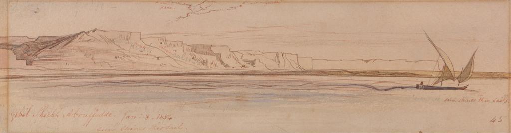 | Keywords: Edward Lear - Gebel Sheikh Abu Fodde - Google Art Project.jpg  inscribed in red brown ink lower left Gebel Sheikh Aboussodde Jany 8 1854 sun shines thru sail ; in brown red ink lower right 45 ; Verso inscribed in brown ink center 9 next below uppermost Not on View Watercolor with pen in brown ink over graphite on moderately thick moderately textured beige wove paper sky water river riverbank sails landscape boat special url_id eQFlXVyyA4Qm7w PD-old-100-1923 1888 Egypt by Edward Lear Nile in art Google Art Project works by Edward Lear 1854 in Egypt Egyptian feluccas in art |
