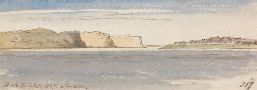 | Keywords: Edward Lear - Ibreem, 10-00 am, 2 February 1867 (317) - Google Art Project.jpg inscribed in pen with brown ink lower left 10 AM 2 Feby 1867 Ibreem ; in brown ink lower right 317 Not on View Watercolor with pen in brown ink over graphite on thick rough cream wove paper sky palm trees water cliffs river landscape special url_id 9QGemb-PPBgkng PD-old-100-1923 1888 Egypt by Edward Lear Nubia in art Qasr Ibrim Historical images of Sudan Nile in Sudan Nile in art Google Art Project works by Edward Lear |
