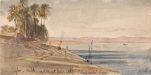| Keywords: Edward Lear - Near Edfu or Kilh - Google Art Project.jpg inscribed in brown ink lower left Near Edfoo or Kilh - 4 P M 25 Jany 1867 Palms catch light ; in brown ink lower right '226 ; verso in graphite cener 161 Not on View Watercolor with pen in brown ink over graphite on medium slightly textured wove paper mounted on thick slightly textured cream wove paper sky palm trees water wall river riverbank hill landscape boats special url_id uQGBbaHLKw97bw PD-old-100-1923 1888 Egypt by Edward Lear Google Art Project works by Edward Lear Egyptian feluccas in art |