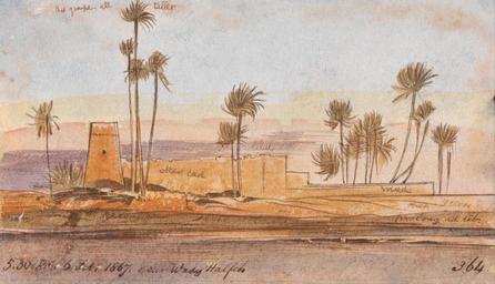 | Keywords: Edward Lear - Near Wady Halfeh - Google Art Project.jpg inscribed in brown ink lower left 5 30 PM 6 Feby 1867 near Wady Halfeh ; in brown ink lower right 364 ; Verso in graphite upper center 220 up 97 next below A Not on View Watercolor witih pen in brown ink over graphite on medium slightly textured beige wove paper sky palm trees sand lake river structure single built work genre subject special url_id GQFtgw4UGbN4AA PD-old-100-1923 1888 Egypt by Edward Lear Google Art Project works by Edward Lear Wadi Halfa Nubia in art |