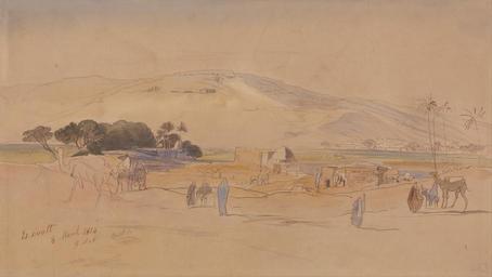 | Keywords: Edward Lear - Oasis Village - Google Art Project.jpg Inscribed in brown ink over graphite lower left Es sioott 8 March 1854 9 AM dust ; in graphite lower right 253 Inscription _Marks Watermark Blind Stamp - Freres letters Not on View Watercolor with pen in brown ink over graphite on medium slightly textured brown wove paper camels mammals palm trees sand dome village ruins hills valley landform oasis buildings robes figures representations landscape desert special url_id YAGBgDL4_nAaLQ PD-old-100-1923 1888 Egypt by Edward Lear Google Art Project works by Edward Lear 1854 in Egypt Oases in Egypt |
