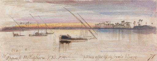 | Keywords: Edward Lear - Opposite Melaghara, 5-20 PM - Google Art Project.jpg Inscribed in brown ink over graphite lower left gray all Opposite Melaghara 5 20 P M; in bdrown ink center SEAREEF ; in bdrown ink lower right Palms also off shy boats black 71 ; Verso in graphite upper left 14 up ; in graphite lower center next above A Not on View Watercolor with pen in brown ink over graphite on moderately thick slightly textured beige wove paper sky sunset palm trees water marine art boats special url_id OgFcsnVGy76dKA PD-old-100-1923 1888 Egypt by Edward Lear Google Art Project works by Edward Lear Sailboats at sunset Egyptian feluccas in art |