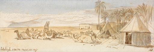 | Keywords: Edward Lear - Salahiyeh - Google Art Project (2301934).jpg inscribed in brown ink lower left Salahiyeh 2 30 PM March 25 1867 ; in brown ink lower right 13 ; Verso in graphite upper left 170 up ; in brown ink upper center next above B ; in graphite center Middle Not on View Watercolor with pen in brown ink over graphite on thick rough cream wove paper sky camels mammals palm trees sand tents building turbans figures representations landscape camp sites temporary settlements special url_id fQF7NA2TJJVn1w PD-old-100-1923 1888 Egypt by Edward Lear Google Art Project works by Edward Lear History of Syria |
