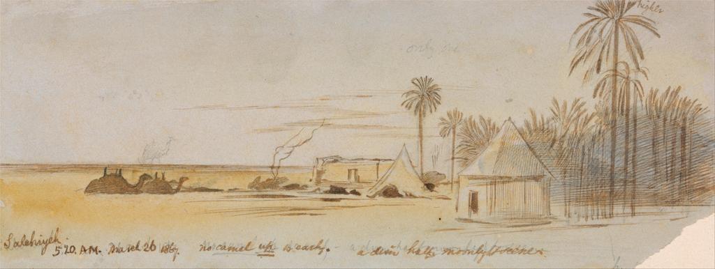 Keywords: Edward Lear - Salahiyeh - Google Art Project (2314771).jpg inscribed in brown ink lower left Salahiyeh Not on View Watercolor with pen in brown ink over graphite on medium slightly textured blue wove paper mounted on thick moderately textured cream wove paper sky camels mammals palm trees sand smoke tents structure single built work landscape camp sites temporary settlements special url_id fQGourxKtmua7A PD-old-100-1923 1888 Egypt by Edward Lear Google Art Project works by Edward Lear History of Syria |