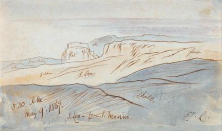 | Keywords: Edward Lear - San Leo from San Marino - Google Art Project.jpg inscscribed in brown ink lower left 5 30 AM May 9 1867 S Leo- from S Marino ; in brown ink lower right 57 C ; Verso in graphite upper center 219 Longwise Top left ; in brown ink lower left Top line one of 4 next B Not on View Watercolor with pen in brown ink over graphite on medium slightly textured cream wove paper sky cliffs hills landscape special url_id UgFeynt-9JEA2g PD-old-100-1923 1888 Paintings by Edward Lear Google Art Project works by Edward Lear |