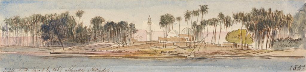 | Keywords: Edward Lear - Sheikh Abadeh, 3-20 pm, 6 January 1867 (85) - Google Art Project.jpg Google Art Project watercolor London 1812 San Remo 1888 Edward male 2324653 Lear British 1812 - 1888 /collection/yale-center-for-british-art/artwork/sheikh-abadeh-320-pm-6-january-1867-85-edward-lear/2411929/ Edward Lear Artist /artist/edward-lear/4129607/ 4129607 /collection/yale-center-for-british-art/ Yale Center for British Art 2305845 http //britishart yale edu/ 2/23/2012 10 18 15 PM /collection/yale-center-for-british-art/artwork/sheikh-abadeh-320-pm-6-january-1867-85-edward-lear/2411929/ 1867 1867 bushes palm trees water domes minaret river buildings landscape boats Watercolor with pen in brown ink over graphite on moderately thick moderately textured beige wove paper 60 2411929 False 1867 3/24/2012 6 34 54 PM YCBA/lido-TMS-5117 http //collections britishart yale edu/vufind/Record/1669360 Yale Center for British Art Gift of Donald C Gallup BA 1934 PhD 1939 painting 1860 1870 San Remo Creation w254 x h60 cm 1867 False 4 23140495867769 Item sheikh-abadeh-320-pm-6-january-1867-85-edward-lear Sheikh Abadeh 3 20 pm 6 January 1867 85 s 254 inscribed in pen with brown ink lower left 3 20 PM Jany 6 1867 Sheikh Abadeh ; in brown ink lower right 85 ; Verso in graphite center 18 up next below top Not on View Watercolor with pen in brown ink over graphite on moderately thick moderately textured beige wove paper bushes palm trees water domes minaret river buildings landscape boats special url_id tQFOLziYHenttw PD-old-100-1923 1888 Egypt by Edward Lear Google Art Project works by Edward Lear |