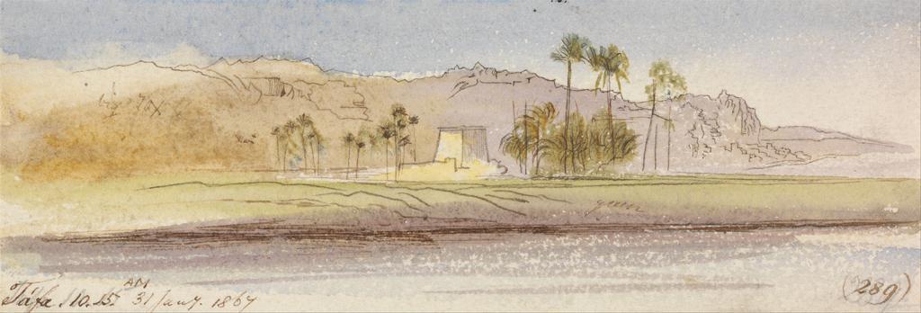 | Keywords: Edward Lear - Tafa, 10-15 am, 31 January 1867 (289) - Google Art Project.jpg inscribed in brown ink lower left Tafa 10 15 AM 31 Jany 1867 ; in brown ink lower right 289 ; Verso in graphite center 185 encircled Not on View Watercolor with pen in brown ink over graphite on thick moderately textured cream wove paper sky palm trees temple ruins river riverbank landscape special url_id swGu90vwLCQE6w PD-old-100-1923 1888 Egypt by Edward Lear Google Art Project works by Edward Lear | ||||