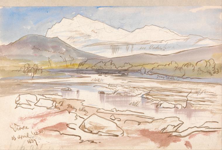 | Keywords: Edward Lear - Vjose, 12-30 p.m., 16 April 1857 - Google Art Project.jpg Google Art Project watercolor London 1812 San Remo 1888 Edward male 2324653 Lear British 1812 - 1888 /collection/yale-center-for-british-art/artwork/vjose-1230-pm-16-april-1857-edward-lear/2409474/ Edward Lear Artist /artist/edward-lear/4129607/ 4129607 /collection/yale-center-for-british-art/ Yale Center for British Art 2305845 http //britishart yale edu/ 2/23/2012 10 14 00 PM /collection/yale-center-for-british-art/artwork/vjose-1230-pm-16-april-1857-edward-lear/2409474/ 1857 1857 rocks water mountains hills landscape Watercolor with pen in brown ink over graphite on medium slightly texture cream wove paper 125 2409474 False 1857 3/25/2012 6 53 30 PM YCBA/lido-TMS-4919 http //collections britishart yale edu/vufind/Record/1669170 Yale Center for British Art Gift of Donald C Gallup BA 1934 PhD 1939 painting 1850 1860 San Remo Creation w194 x h125 cm 1857 False 1 48405797101449 Item vjose-1230-pm-16-april-1857-edward-lear Vjose 12 30 p m 16 April 1857 v 194 Inscribed in brown ink lower left Viosa 16 April 12 30 1857 Not on View Watercolor with pen in brown ink over graphite on medium slightly texture cream wove paper rocks water mountains hills landscape special url_id xQHtcnLiyuw4OA PD-old-100-1923 1888 Paintings by Edward Lear Google Art Project works by Edward Lear |