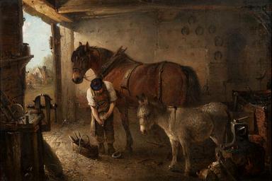| Keywords: Edward Robert Smythe A farrier shoeing a plough horse.jpg A farrier shoeing a plough horse with a donkey in a forge interior Signed E R Smythe Oil on canvas 61 x 91 5 cm http //www bonhams com/ Bonhams by 1899 Edward Robert Smythe 1810-1899 PD-old-100 Images from Bonhams Edward Robert Smythe Farriers in art People with donkeys in art 19th-century genre paintings Paintings of men with horses | ||||