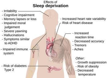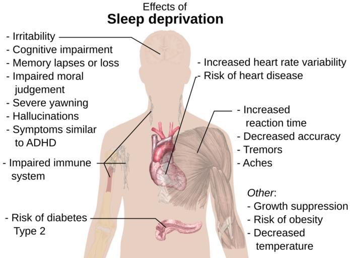| Keywords: Effects of sleep deprivation.svg BadSVG en Main health effects of sleep deprivation See Wikipedia Sleep deprivation <P>To discuss image please see Template talk Häggström diagrams List <br> - Hallucinations <ref>http //www ninds nih gov/disorders/brain_basics/understanding_sleep htm National Institute of Neurological Disorders and Stroke -- Brain Basics Understanding Sleep</ref> - Irritability <ref name SleepDep > http //www betterhealth vic gov au/bhcv2/bhcarticles nsf/pages/Sleep_deprivation OpenDocument </ref> - Cognitive impairment <ref name Stevens/> - Memory lapses or loss <ref>http //www apa org/ed/topss/bryanread html Teachers of Psychology in Secondary Schools</ref> - Severe yawning <ref name SleepDep /> - Symptoms similar to ADHD Attention Deficit Hyperactivity Disorder <ref name SleepDep /> - Impaired moral judgement <ref> cite journal The Effects of 53 Hours of Sleep Deprivation on Moral Judgment Journal SLEEP 30 3 http //www journalsleep org/ViewAbstract aspx citationid 3172 </ref> - Decreased reaction time and accuracy <ref name Drunkhazard > http //oem bmjjournals com/cgi/content/abstract/57/10/649 Occup Environ Med 2000;57 649-655 doi 10 1136/oem 57 10 649 </ref> - Tremors <ref> cite book Smith Andrew P Handbook of Human Performance p 240 </ref> - Aching muscles <ref> cite book Morin Charles M Insomnia p 28 </ref> - Risk of Diabetes Type 2 <ref name DGottlieb > cite journal Daniel J Gottlieb et al Association of Sleep Time With Diabetes Mellitus and Impaired Glucose Tolerance Arch Intern Med Vol 165 No 8 2005; 165 863-867 PMID 15851636 </ref> - Growth suppression <ref name BlockQuote >Sleep deprivation effects on the activity of the hypothalamic-pituitary-adrenal and growth axes potential clinical implications Alexandros N Vgontzas George Mastorakos Edward O Bixler Anthony Kales Philip W Gold George P Chrousos published in Clinical Endocrinology Volume 51 Issue 2 Page 205 August 1999</ref> <ref name Stevens/> - Risk of obesity <ref name Hasler>http //www ncbi nlm nih gov/entrez/query fcgi itool abstractplus db pubmed cmd Retrieve dopt abstractplus list_uids 15283000 The association between short sleep duration and obesity in young adults a 13-year prospective study Sleep Jun 15;27 4 661-6 2004</ref> <ref name Gangwisch>http //www ncbi nlm nih gov/entrez/query fcgi db pubmed cmd Retrieve dopt AbstractPlus list_uids 16295214 query_hl 2 itool pubmed_XML Inadequate sleep as a risk factor for obesity analyses of the NHANES I Oct 1;28 10 1289-96 2005</ref> - Decreased temperature <ref name Stevens>http //emedicine medscape com/article/1188226-overview eMedicine Specialties > Neurology > Sleep-Related Diseases > Normal Sleep Sleep Physiology and Sleep Deprivation Author M Suzanne Stevens MD Updated Oct 29 2008</ref> - Increased heart rate variability <ref name Stevens/> - Risk of heart disease <ref>http //www webmd com/heart-disease/news/20030127/sleep-less-more-linked-to-heart-disease Sleep Less and More Linked to Heart Disease By Jeanie Lerche Davis </ref> - Impaired immune system <ref name Stevens/> References reflist All used images are in public domain Mikael Häggström gallery of 2014 2009-05-29 thumb left png-format Next update Increased reaction time to delayed reaction time to avoid confusion Cc-zero Häggström diagrams ImageNote 1 594 209 226 109 1480 1090 2 Dizziness and nausea ImageNoteEnd 1 SVG diagrams of the adult male human body by Mikael Häggström Sleep deprivation |
