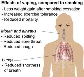 | Keywords: Effects of vaping compared to smoking (raster).png vaping compared to tobacco smoking Entries Switching from tobacco to vaping reduced weight gain after smoking cessation<ref name Sanford2014/> increased exercise tolerance<ref name Sanford2014> cite journal Sanford Z Goebel L E-cigarettes an up to date review and discussion of the controversy W V Med J 110 4 10 “5 2014 25322582 </ref> reduced risk of death<ref name Caponnetto2013> cite journal Caponnetto P Russo C Bruno C M Alamo A Amaradio M D Polosa R Electronic cigarette a possible substitute for cigarette dependence Monaldi Archives for Chest Disease 79 1 2015 1122-0643 10 4081/monaldi 2013 104 23741941 </ref> Mouth and airways Reduced spitting sore throat and cough<ref name Dagaonkar2014> cite journal Dagaonkar RS R S Udwadi Z F Water pipes and E-cigarettes new faces of an ancient enemy Journal of the Association of Physicians of India 62 4 2014 324-328 http //www japi org/april_2014/05_ra_water_pipes pdf 25327035 </ref> Lungs Reduced shortness of breath<ref name Dagaonkar2014/> References reflist <P>To discuss image please see Template talk Human body diagrams All used images are in public domain Mikael Häggström 2015-07-10 Effects of vaping compared to smoking vector svg Human body diagrams Diagrams of the adult male human body by Mikael Häggström |