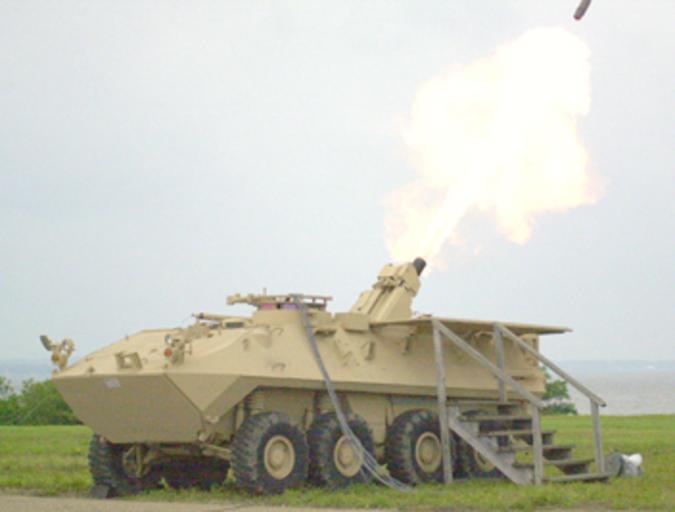 Keywords: EFSS Dragonfire2.png A Dragon Fire 120mm mortar mounted on a Marine Corps Light Armored Vehicle fires during a recent test at the Naval Surface Warfare Center in Dahlgren Va 2003 press release from Picatinny Arsenal found at http //www pica army mil/voice2003/030912/Dragonfire htm PD-USGov-Military-Navy Firing mortars |