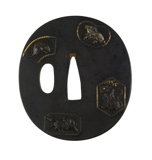 Keywords: Egawa Toshinari - Tsuba with Animals from the Chinese Zodiac - Walters 51275.jpg The Chinese zodiac which is also used in Japan assigns an animal to each year There are twelve animals in total six of which are depicted on this tsuba The other six animals were probably used to decorate other sword fittings used with the tsuba Each animal is placed within its own cartouche On the front of the tsuba are a rat a goat a tiger and a horse On there reverse are a snake and an ox ca 1800 1825 late Edo nigurome gold shibuichi shakudo copper cm 6 9 6 4 0 35 accession number 51 275 36580 Henry Walters Baltimore date and mode of acquisition unknown Walters Art Museum Henry Walters Acquired by Henry Walters Signature Egawa Toshio place of origin Japan Walters Art Museum license Tsuba in the Walters Art Museum Egawa Toshinari Media contributed by the Walters Art Museum needs category review