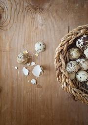 Keywords: egg quail eggs broken wood natural product basket close still life