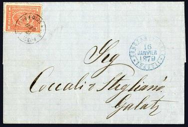 | Keywords: Egypt P. O. Chios 1879.jpg en Letter mailed at the Egyptian post office at Chios in 1879 Chios was part of the Ottoman Empire until its annexation to Greece in 1912 <br> The letter franked with a regular Egyptian stamp is cancelled by V R Posta Egiziane Scio The letter was routed to the Egyptian post office in Constantinople transferred to the French post office there sent by steamer to Odessa and from there sent by rail to Galatz in Moldavia Romania 2014-10-11 12 01 50 Grosvenor Philatelic Auctions Letter mailed in 1879 other versions PD-old-100 Uploaded with UploadWizard Foreign post offices in the Ottoman Empire Chios Post of Egypt |