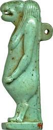| Keywords: Egyptian - Amulet-pendant, of Taweret - Walters 481557 - Left.jpg Taweret the Great Female One was represented as a pregnant hippopotamus with lion paws and a crocodile back and tail She was one of the most popular protective deities of ancient Egypt being responsible for pregnant women and small children The goddess is represented in her standard form She is standing upright with her left foot forward She has a hippopotamus body and head a crocodile back and tail lion paws and female arms and breasts Her mouth is open to show her dangerous teeth The amulet has a small base and a loop on the back late 4th-3rd century BC Late Period-early Greco-Roman Egyptian faience with blue-green glaze cm 6 54 0 87 1 accession number 48 1557 33216 Lambros or Dattari date and mode of acquisition unknown Henry Walters Baltimore 1930 mode of acquisition unknown Walters Art Museum Henry Walters Acquired by Henry Walters 1930 Faience The Colors of the Heavens The Walters Art Museum Baltimore; The Walters Art Museum Baltimore 2003-2004 Daily Magic in Ancient Egypt The Walters Art Museum Baltimore 2006-2007 place of origin Egypt Walters Art Museum license Ancient Egyptian amulets in the Walters Art Museum Ancient Egyptian faience in the Walters Art Museum Works of the Egyptian late period Taweret amulets |