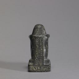 | Keywords: Egyptian - Block Statue of Kha-em-Waset - Walters 2268 - Back.jpg This piece is a small serpentine New Kingdom block statue of Kha-em-Waset Kha-em-Waset was a noble who held the titles of Fan-Bearer and Chief of Works in the Temple of Amun This statue would have been placed as a votive in the temple of Amun Kha-em-Waset sits with his knees drawn up upon a rectangular bench which in turn rests upon a rectangular base The back right corner of the base is missing There is a rectangular back plinth behind him He wears a long smooth ankle-length garment The outlines of his legs are visible in profile and his arms are visible within the garment as well His arms are folded and hands rest flat upon his upper arms An insignia on his upper right arm identifies him as belonging to the Temple of Amun There are two vertical columns of hieroglyphics text on the front of his garment and on the back plinth A single horizontal band of text surrounds the base His wig is a New Kingdom combination of delicate wavy strands over plaited curls His eyes are large and recall the orientalized almond-shaped eyes of Amenhotep III His lips are thick and form a slight smile His ears are unusually pointed He has a short squared beard ca 1370 1360 BC New Kingdom black serpentine cm 8 6 4 1 6 1 accession number 22 68 17604 Dikran Kelekian New York and Paris Henry Walters Baltimore date of acquisition unknown by purchase Walters Art Museum Henry Walters Acquired by Henry Walters Translation All things which go forth on the offering table of Amun lord of coolness and dryness for the fan-bearer Kha-em-Waset; Translation The true admirable one of good character of kindly manners who is not negligent the fan bearer of the troop Beautiful is the yeomanry Kha-em-Waset; Translation An offering which the king gives to Amun-Re King of the gods that he may give a good life to him who is devoted to him and puts himself upon his face the fan-bearer Kha-em-Waset An offering which the king gives to Amun-Re lord of coolness and dryness that he may give a good life in following him until he reaches the age in goodness to the fan-bearer Kha-em-Waset //// the Chief of the works in the Temple of Amun Mark Temple of Amun place of origin Temple of Amun-Re in Karnak Egypt Walters Art Museum license Ancient Egyptian block statues in the Walters Art Museum Statues of the 19th dynasty of Egypt Statues from Karnak temple complex |