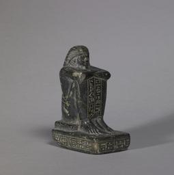 | Keywords: Egyptian - Block Statue of Kha-em-Waset - Walters 2268 - Three Quarter.jpg This piece is a small serpentine New Kingdom block statue of Kha-em-Waset Kha-em-Waset was a noble who held the titles of Fan-Bearer and Chief of Works in the Temple of Amun This statue would have been placed as a votive in the temple of Amun Kha-em-Waset sits with his knees drawn up upon a rectangular bench which in turn rests upon a rectangular base The back right corner of the base is missing There is a rectangular back plinth behind him He wears a long smooth ankle-length garment The outlines of his legs are visible in profile and his arms are visible within the garment as well His arms are folded and hands rest flat upon his upper arms An insignia on his upper right arm identifies him as belonging to the Temple of Amun There are two vertical columns of hieroglyphics text on the front of his garment and on the back plinth A single horizontal band of text surrounds the base His wig is a New Kingdom combination of delicate wavy strands over plaited curls His eyes are large and recall the orientalized almond-shaped eyes of Amenhotep III His lips are thick and form a slight smile His ears are unusually pointed He has a short squared beard ca 1370 1360 BC New Kingdom black serpentine cm 8 6 4 1 6 1 accession number 22 68 17604 Dikran Kelekian New York and Paris Henry Walters Baltimore date of acquisition unknown by purchase Walters Art Museum Henry Walters Acquired by Henry Walters Translation All things which go forth on the offering table of Amun lord of coolness and dryness for the fan-bearer Kha-em-Waset; Translation The true admirable one of good character of kindly manners who is not negligent the fan bearer of the troop Beautiful is the yeomanry Kha-em-Waset; Translation An offering which the king gives to Amun-Re King of the gods that he may give a good life to him who is devoted to him and puts himself upon his face the fan-bearer Kha-em-Waset An offering which the king gives to Amun-Re lord of coolness and dryness that he may give a good life in following him until he reaches the age in goodness to the fan-bearer Kha-em-Waset //// the Chief of the works in the Temple of Amun Mark Temple of Amun place of origin Temple of Amun-Re in Karnak Egypt Walters Art Museum license Ancient Egyptian block statues in the Walters Art Museum Statues of the 19th dynasty of Egypt Statues from Karnak temple complex |