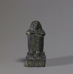 | Keywords: Egyptian - Block Statue of Kha-em-Waset - Walters 2268.jpg This piece is a small serpentine New Kingdom block statue of Kha-em-Waset Kha-em-Waset was a noble who held the titles of Fan-Bearer and Chief of Works in the Temple of Amun This statue would have been placed as a votive in the temple of Amun Kha-em-Waset sits with his knees drawn up upon a rectangular bench which in turn rests upon a rectangular base The back right corner of the base is missing There is a rectangular back plinth behind him He wears a long smooth ankle-length garment The outlines of his legs are visible in profile and his arms are visible within the garment as well His arms are folded and hands rest flat upon his upper arms An insignia on his upper right arm identifies him as belonging to the Temple of Amun There are two vertical columns of hieroglyphics text on the front of his garment and on the back plinth A single horizontal band of text surrounds the base His wig is a New Kingdom combination of delicate wavy strands over plaited curls His eyes are large and recall the orientalized almond-shaped eyes of Amenhotep III His lips are thick and form a slight smile His ears are unusually pointed He has a short squared beard ca 1370 1360 BC New Kingdom black serpentine cm 8 6 4 1 6 1 accession number 22 68 17604 Dikran Kelekian New York and Paris Henry Walters Baltimore date of acquisition unknown by purchase Walters Art Museum Henry Walters Acquired by Henry Walters Translation All things which go forth on the offering table of Amun lord of coolness and dryness for the fan-bearer Kha-em-Waset; Translation The true admirable one of good character of kindly manners who is not negligent the fan bearer of the troop Beautiful is the yeomanry Kha-em-Waset; Translation An offering which the king gives to Amun-Re King of the gods that he may give a good life to him who is devoted to him and puts himself upon his face the fan-bearer Kha-em-Waset An offering which the king gives to Amun-Re lord of coolness and dryness that he may give a good life in following him until he reaches the age in goodness to the fan-bearer Kha-em-Waset //// the Chief of the works in the Temple of Amun Mark Temple of Amun place of origin Temple of Amun-Re in Karnak Egypt Walters Art Museum license Ancient Egyptian block statues in the Walters Art Museum Statues of the 19th dynasty of Egypt Statues from Karnak temple complex |