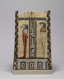| Keywords: Egyptian - Box for Ushabtis or Canopic Jars - Walters 626 - Side B.jpg Egypt en Box for Ushabtis or Canopic Jars During the New Kingdom ushabti figures were often placed in a painted wooden box shaped like a shrine Only the sides of this box are preserved and it may have held a number of ushabti figures or a set of canopic jars The deities associated with death and the afterlife are represented on the box's panels There is the figure of a jackal on top of a shrine which represents the embalming god Anubis Isis and Nephthys flank the large symbol of Osiris and the four sons of Horus All of the inscriptions are related to the god Osiris ca 850 700 BC Third Intermediate wood with paint cm 41 27 20 accession number 62 6 2451 Dr J Beekmans Holland Robert T Clough Keighley Yorkshire Walters Art Museum 1965 by purchase Museum purchase with funds provided by the S A P Fund 1965 In Search of Ancient Treasure 40 Years of Collecting The Walters Art Gallery Baltimore 1978 place of origin Egypt Walters Art Museum license Ancient Egyptian art in the Walters Art Museum Works of the Egyptian third intermediate period Ushabti box Media contributed by the Walters Art Museum needs category review |