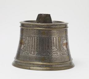| Keywords: Egyptian - Candlestick Base - Walters 54459 - View F.jpg Throughout Islamic history sultans princes and court officials have been active art patrons This impressive candlestick base was commissioned by Zayn al-Din Kitbugha who served as saqi or cupbearer at the court of the Mamluk Dynasty in Egypt before ascending the throne in 1294 The large inscription in thuluth script around the candlestick's body is punctuated by roundels featuring a stemmed cup Kitbugha's blazon or heraldic shield Calligraphy is also a major decorative element In addition to the large thuluth inscription this piece includes different sizes and styles of Arabic script Despite its elaborate design Kitbugha had the candlestick made for use in his household storeroom or pantry The candlestick's neck and socket- today in the Museum of Islamic Art Cairo- already had been removed when Mr Walters added the piece to his growing collection of Islamic art ca 1290 Mamluk; Bahri brass with silver gold and copper inlays cm 26 5 32 5 accession number 54 459 15804 Dikran Kelekian New York and Paris Henry Walters city Baltimore Walters Art Museum Henry Walters Acquired by Henry Walters 1925 Transcription Inscribed base and neck Zayn al-Din Kitbugha; Translation Inscribed base in thuluth script This is one of the things made for the servery of the lofty authority the lordly the great amir the conqueror the holy warrior the just al-Zayni Zayn al-Din Kitbugha al-Mansuri al-Ashrafi of the households of the sultans Qalawun and Khalil The Arts of Islam Hayward Gallery London 1976 Renaissance of Islam Art of the Mamluks Smithsonian National Museum of Natural History Washington; Minneapolis Institute of Arts Minneapolis; The Metropolitan Museum of Art New York; Cincinnati Art Museum Cincinnati; The Detroit Institute of Arts Detroit; Crocker Art Museum Sacramento; San Diego Museum Of Art San Diego; Phoenix Art Museum Phoenix; Wadsworth Atheneum Museum of Art Hartford 1981-1983 Highlights from the Collection The Walters Art Gallery Baltimore 1998-2001 place of origin Egypt Walters Art Museum license Islamic metalwork in the Walters Art Museum Media contributed by the Walters Art Museum needs category review Metalwork of Egypt Al-Adil Kitbugha |