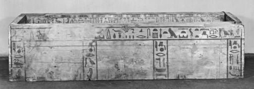 | Keywords: Egyptian - Coffin of Rehu-er-djer-sen - Walters 625 - Profile.jpg This coffin made for a man named Rehu-er-djer-sen is an early form of burial container The exterior was left largely unpainted perhaps because it was made from expensive imported cedar wood The interior is painted with brightly colored objects and offerings considered essential to a wealthy burial Coffin Texts common to coffins of the early Middle Kingdom were written on the wood to help the owner gain access to the afterlife The texts are a series of magical spells intended to safeguard the body and spirit of the deceased and ensure resurrection Deities were also depicted from the myth of Osiris that guaranteed protection In the afterlife the individual was to travel the heavens with the sun-god Re Hieroglyphic inscriptions on the exterior of the coffin include a prayer to Osiris for funerary offerings Along the floor of the coffin flows the Nile of the underworld Rehu-er-djer-sen would have lain on his side so he might see the world through the eyes painted on the outside of the coffin ca 2000 1950 BC Middle Kingdom wood with polychrome cm 50 5 215 51 4 ; cover cm 7 62 51 1 216 accession number 62 5 30212 Lady Meux London date and mode of acquisition unknown William Randolf Hearst California date and mode of acquisition unknown Joseph Brummer New York date and mode of acquisition unknown Brummer Estate Sale New York 1949 pt II no 70 Walters Art Museum 1949 by purchase Museum purchase 1949 The inscriptions contain offering formulas spells of the coffin texts and names the owner Rehu-er-djer-sen In Search of Ancient Treasure 40 Years of Collecting The Walters Art Gallery Baltimore 1978 place of origin Egypt Walters Art Museum license Ancient Egyptian sarcophagi in the Walters Art Museum Sarcophagi of the Egyptian Middle Kingdom Sancturay hieroglyph Quail chick hieroglyph |