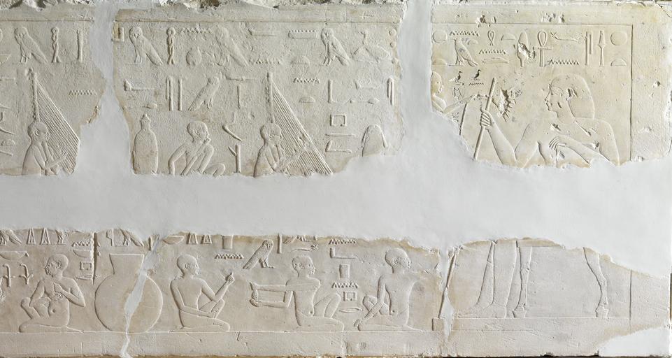 | Keywords: Egyptian - Lintel with Musicians and Game Players - Walters 22152-22153 - Detail B.jpg This block probably once served as the lintel of a doorway in the tomb of Ankh-ef-en-sekhmet He is represented on the right side of the lintel Carved in very low relief this piece depicts musicians and game-players before the deceased Ankh-ef-en-Sakhmet The entire relief has a plain border running around its perimeter At the right is the deceased seated and facing left He sits upon a high-backed and armed chair with cow's legs which sits upon some type of mat He holds a staff in his right hand while his left hand rests on the arm of the chair In front of him is the upper part of a figure who places a lotus blossom in front of his face Behind him are three groups of performers the first one a harpist and a flute-player the second one a harpist and a double clarinet-player and the third one consisting of three singers; they are separated from each other by large vessels In the lower row is depicted a person who turns to grab the staff of Ankh-ef-en-Sakhmet followed by three pairs of game-players The group farthest to the right consists of two pairs of people playing the game mehen while the group behind them consists of two men playing senet There is a row of inscriptions at the top of the piece along with captions referring to each of the performers in the upper row and the words spoken by each of the members of the groups of game players in the lower row There are also intrusive inscriptions between Ankh-ef-en-Sakhmet's staff and the head of the lotus blossom-holder and in front of each of the two individuals playing senet in the lower left corner of the piece They were added in the 27th Dynasty in the time of Darius I and Artaxerxes I There is still a large piece missing between Walters 22 152 and 22 153 and a smaller piece missing between those two and the piece formerly in Seattle upper right There is a faint trace of red on the large figure's shoulder not quite large enough to establish that the whole was painted though it is quite possible that it was 550-525 BC; Secondary inscriptions 500-450 BC Late Period limestone with remains of red and black paint cm 48 144 ; framed cm 52 150 9 accession number 22 152-22 153 34307 22 152 Khawam brothers Dikran Kelekian New York and Paris Henry Walters city Baltimore Walters Art Museum 1931 by bequest 22 152C Seattle Art Museum date and mode of acquisition unknown Walters Art Museum 1957 by purchase 22 153 Khawam brothers Dikran Kelekian New York and Paris Henry Walters city Baltimore Walters Art Museum Henry Walters Acquired by Henry Walters 1930 and 1931 and Museum purchase 1957 In Search of Ancient Treasure 40 Years of Collecting The Walters Art Gallery Baltimore 1978 place of origin Memphis Egypt Walters Art Museum license Ancient Egyptian reliefs in the Walters Art Museum Ancient Egyptian art from Memphis Games of Ancient Egypt Musical instruments in ancient Egypt Harps in ancient Egypt Mehen game in Ancient Egypt Ankh-ef-en-sekhmet |