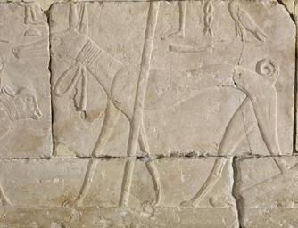 | Keywords: Egyptian - Man with Calf and Dog - Walters 22422 - Detail B.jpg This Old Kingdom relief fragment has suffered severe damage from salt since its original carving This has caused pitting over many areas of the piece especially on the foot of the man the calf and the dog The preserved carving is in fine raised relief including such small details as the hair at the tip of the calf's tail and the 'elbow' on each of the dog's legs The block was originally painted and traces of red pigment still remains in some areas There are two separate scenes actually depicted easily distinguished by the different scales of the figures On the left is a man at small scale who bends over a calf pushing at the rear with one hand while pulling on the rope tied around it's neck with the other A single man doing this is uncommon and the sharp angle at which the servant bends in order to simultaneously lead and push the calf from behind is also unusual The man has short hair and wears a short fitted shendyt with a large tie at the waist This type of shendyt is first seen in the 4th Dynasty but continues into the 6th Dynasty The musculature of the man's biceps is paralleled in tombs of both the 4th and 5th Dynasty such as the tomb of Nofer at Giza and that of Sekhem-ankh-ptah at Saqqara Above the calf is an inscription which reads Bringing the calf jn t bhz Facing the man and calf is a dog identifiable by his long narrow muzzle nearly straight facial profile slender body long neck and limbs Brewer 116 as a greyhound with a rope collar and curled tail The dog stands at his master's feet to whose scale he is carved The tomb owner's staff crosses the body of the dog as does his left foot Above the dog is his name Beha bh3 possibly an abbreviation of behkai oryx antelope a dog's name known from other contexts Beginning in the 5th Dynasty dogs are commonly placed in hunting scenes in the fields or under the deceased's chair However a very similar scene to this one in which the tomb owner stands with his dog at his feet can be found at Giza in the tomb of Ha-ef-Ra-ankh from the middle or late 5th Dynasty The type of the dog as well as his collar are so similar that it is likely that the relief comes from this tomb or was made by the same craftsmen team in a tomb nearby The dual composition of the relief fragment suggests it is part of a larger wall scene in which various servants of the tomb owner's estate bring and present the products and wealth of his holdings to him During the Old Kingdom these types of scenes were generally placed on the east and west walls of a tomb The thick border which forms the left edge and base of the scene might imply that it was located either next to a door or as part of a long wall with multiple false doors and/or multiple scenes The tomb from which the fragment originated must be located at Giza and dates to the middle or late 5th Dynasty based on relief and composition ca 2400 BC Old Kingdom carved limestone red pigment cm 43 101 3 5 accession number 22 422 22038 Paris 1914 First time reported by the Egyptologist Raymond Weill who saw the relief in Paris in 1914 Joseph Brummer New York and Paris date and mode of acquisition unknown Parke-Bernet Galleries New York 1949 101 lot 474 Walters Art Museum 1949 by purchase Museum purchase 1949 Transcription Inscription above the dog bh3; Translation Inscription above the dog Beha name of dog; Transcription Inscription above the calf jn t bhz; Translation Inscription above the calf Bring the calf To Arrest the Ravages of Time Caring for Art at the Walters The Walters Art Gallery Baltimore 1996 In Search of Ancient Treasure 40 Years of Collecting The Walters Art Gallery Baltimore 1978 place of origin Giza Egypt Walters Art Museum license Ancient Egyptian reliefs in the Walters Art Museum Dogs in Ancient Egyptian art Tesem Sighthounds Sloughi hieroglyph Sloughis in art Ancient Egyptian art from Giza necropolis |