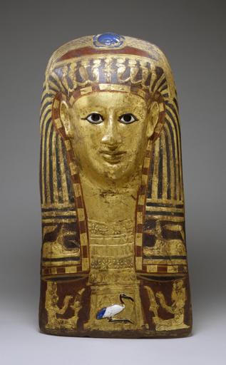 | Keywords: Egyptian - Mummy Mask of a Woman - Walters 783.jpg Mummy masks of the Hellenistic and Roman periods often had gilded faces that reflected the association of the deceased with the gods This mask has been molded over a core with layers of mud and linen The decoration was applied in layers with the gilding at the end The eye inlays are made from glass as well as the blue scarab on the top of the head and the ibis inside of a pectoral on the chest The scarab has gilded wings which stretch down to the sides of the wig Above the forehead is a frieze of uraeus serpents with sun-disks on their heads At the right and left frontal ends of the wig are recumbent jackals A golden collar with five rows of rosettes and geometric patterns adorns the mask suspended from which two kneeling goddesses flank the pectoral with an ibis The goddesses may be identified as Isis and Nephthys each with a sun-disk on her head and a feather-fan in one hand Mummy masks were used to protect and idealize the facial features of the deceased The golden face of this mask shows no signs of age gender or emotions The eyebrows nose mouth chin and ears are very well modeled but without color accents The motif ensemble of the mask symbolizes protection uraeus serpents jackals general renewal scarab-beetle and divine support to pass the court of death Thoth-ibis goddesses and to be renewed in the afterlife amongst the deities reflected in the golden color of the face 50 BC-AD 50 Greco-Roman painted cartonnage gold leaf and glass inlays cm 50 9 26 14 3 accession number 78 3 12963 Dikran Kelekian New York and Paris Henry Walters city Baltimore Walters Art Museum Henry Walters Acquired by Henry Walters 1913 3000 Years of Glass Treasures from The Walters Art Gallery The Walters Art Gallery Baltimore 1982 Highlights from the Collection The Walters Art Gallery Baltimore 1998-2001 place of origin Tuna el-Gebel in present-day Egypt Walters Art Museum license Ancient Egyptian art in the Walters Art Museum Ancient Egyptian funerary masks Works of Greco-Roman Egypt |