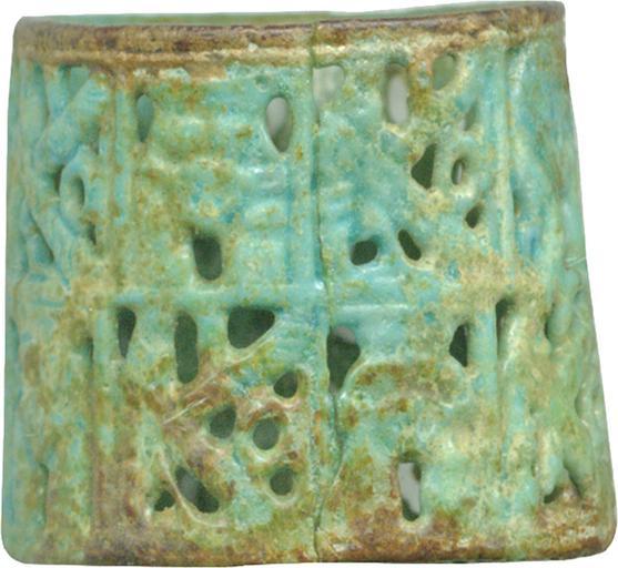Keywords: Egyptian - Ring with Horus and Hathor - Walters 481620 - View B.jpg A fragile openwork ring made of faience with designs in superimposed registers of plaques The god Horus represented as a hawk with disk on head one wing up one down foot forward alternates with heads of the cow-eared goddess Hathor In all but one plaque she wears a low crown In one she wears the characteristic heavy wig with spiral curls century 10 8 BC faience with blue glaze H 9/16 x W 7/8 x Outer Diam 9/16 in 1 42 x 2 2 x 1 5 cm accession number 48 1620 1457 Henry Walters Baltimore date and mode of acquisition unknown Walters Art Museum Henry Walters Acquired by Henry Walters Jewelry - Ancient to Modern The Walters Art Gallery Baltimore 1979-1980 place of origin Egypt Walters Art Museum license Ancient Egyptian jewellery in the Walters Art Museum Ancient Egyptian faience in the Walters Art Museum Media contributed by the Walters Art Museum needs category review |