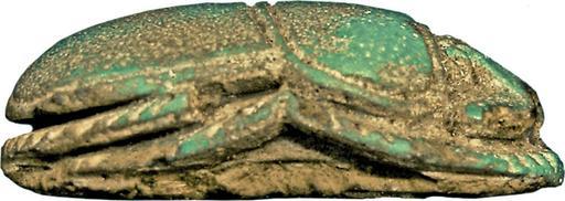 | Keywords: Egyptian - Scarab Amulet - Walters 422 - Right.jpg The ancient Egyptians believed that the dung beetle the Scarabaeus sacer was one of the manifestations of the sun god Representations of these beetles were used as amulets and for ritual or administrative purposes The bottom of this scarab displays a motif that combines the figure of a jackal with nine captives The reclining jackal's head is raised and his tail hanging down Below his body are nine prisoners in three rows depicted; they are kneeling on the ground with their arms fettered behind their backs The jackal is the dominant icon in the composition according to his size and superior position The slim figures of the prisoners are not intended to represent individual persons but a group; all have the same posture and are placed in a symmetrical order; only the position of the fettered arms shows minor variations An oval line frames the motif The highest point of the back is the pronotum dorsal plate of the prothorax Pronotum and elytron wing cases have incised borderlines a double curved partition line and one division line between the wing cases with a scutellum small central triangle at the upper end The semicircular head is flanked by quarter-ovoid eyes; the side plates are quarter-circular and the clypeus front plate has two central base notches The raised extremities have natural form as well as diagonal hindlegs and vertical frontlegs hatch notches on the upper sides for tibial teeth and pilosity hair The proportions of the top are slightly unbalanced the elytron short and the clypeus and plates very large in comparison to the small head The base has a symmetrical long-oval shape The scarab is longitudinally pierced was originally mounted or threaded and used as an institutional funerary amulet The motif on the bottom represents the administrative seal of the Thebes' necropolis but was also used in other cemeteries Nevertheless the faience material makes it doubtful that the scarab was really used as an official seal It seems more likely that the scarab was used as a protective funerary amulet that should guarantee the security of the tomb in this world and be effective against dangers in the afterlife This seal was used since the late 18th Dynasty; comparable seal impressions were found e g in the tomb of king Tutankhamen and a seal matrix made of faience is today in the Myers Museum at the Eton College between 1330 1213 BC New Kingdom faience with green-blue glaze cm 4 8 2 9 1 7 accession number 42 2 3485 Henry Walters Baltimore 1924 mode of acquisition unknown Walters Art Museum Henry Walters Acquired by Henry Walters 1924 place of origin Egypt Walters Art Museum license Ancient Egyptian scarabs in the Walters Art Museum Scarab amulet Media contributed by the Walters Art Museum needs category review |