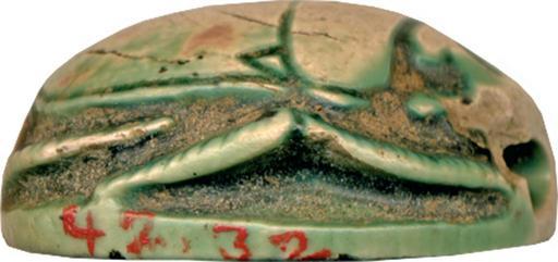 | Keywords: Egyptian - Scarab with the Cartouche of Thutmosis III - Walters 4232 - Right.jpg The ancient Egyptians believed that the dung beetle the Scarabaeus sacer was one of the manifestations of the sun god Representations of these beetles were used as amulets and for ritual or administrative purposes This scarab has a bottom inscription which consists of three columns framed by an oval line; the central column has a royal cartouche The text contains the name titles and epithets of King Thutmose III The inscription is carved in sunken relief The layout is arranged to fit in the oval frame but the two outer columns are not well balanced and some signs collide with the borderline The shape of the hieroglyphs is slightly rough and the nfr-sign has three instead of two horizontal lines The highest point of the back is partition between pronotum dorsal plate of the prothorax and elytron wing cases Pronotum and elytron display incised borderlines single separation lines and V-shaped marks for the humeral callosities thickenings at the shoulders The borderlines of the elytron ends at the rear in half spirals The proportions of the top are unbalanced the pronotum and head section are short in comparison to the elytron The head has long-oval shape the side plates are irregularly trapezoidal and clypeus front plate shows a central base notch The carved extremities show natural form and vertical hatch lines on the upper sides for the tibial teeth and pilosity hair The symmetrical base has a long-oval shape; and the drill-holes of the scarab are framed The scarab is longitudinally pierced was originally mounted or threaded and functions as an amulet This amulet should ensure for its owner support by the royal authority cartouche of the divine king title Perfect God and all-inclusive protection epithet who reverses the foreign countries The scarab was produced after the death of King Thutmose III who was most probably understood as a protective god and successful model of divine kingship The change of the royal title nb t3 wj Lord of the Two Lands to nb t3 w Lord of the Lands may be either a writing mistake or a variant to make the title match to the plural form in the epithet formula all foreign countries The esthetical balance of the signs four horizontal signs at each side of the cartouche may have played a role also between 1292 1186 BC New Kingdom light beige steatite with green-blue glaze cm 0 9 1 5 1 9 accession number 42 32 6551 Henry Walters Baltimore date and mode of acquisition unknown Walters Art Museum Henry Walters Acquired by Henry Walters Translation The Perfect God the Lord of the Lands / Men-kheper-Re / who reverses the foreign countries Secret Signs Egyptian Writing The Walters Art Museum Baltimore 2003-2004 place of origin Egypt Walters Art Museum license Ancient Egyptian scarabs in the Walters Art Museum |