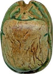 | Keywords: Egyptian - Scarab with Perfect Existence Signs - Walters 4237 - Back.jpg This steatite scarab has a flat underside with a horizontally arranged design with three script signs two repeated The design of the back is simple with slightly unbalanced proportions The workmanship of the piece is good and it is simply made This amulet has a recreative and /or good luck connotation; the duplication of the signs should strengthen the effect The third sign is either a fill character or refers to the all-inclusiveness of 'perfect existence ' The scarab originally would have been mounted or threaded The combination of signs on the bottom of this scarab is not common ca 1648 1539 BC Second Intermediate; Hyksos; late MB IIB beige-brown steatite with green-blue glaze cm 1 1 5 2 1 accession number 42 37 36102 Henry Walters Baltimore date and mode of acquisition unknown Walters Art Museum Henry Walters Acquired by Henry Walters Translation Sign combination two scrabs above an nb-basket flanked by nfr-signs Perfect existence perfect existence place of origin Egypt Walters Art Museum license Ancient Egyptian scarabs in the Walters Art Museum Media contributed by the Walters Art Museum needs category review |