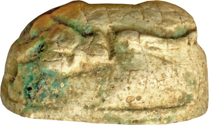 Keywords: Egyptian - Scaraboid with Crouching Calf - Walters 4270 - Back View A.jpg The ancient Egyptians believed that the dung beetle the Scarabaeus sacer was one of the manifestations of the sun god Representations of these beetles were used as amulets and for ritual or administrative purposes Amulets with oval base and half-ovoid back representing other animals are named scaraboids This scaraboid displays the representation of a crouching calf The calf is facing to the right the head as well as the tail raised and bent back to the center of the back The figure fills the whole oval space; head tail and extremities are very close to the body giving a compact and balanced impression The unusual height of the scaraboid conveys the idea that the calf is crouching on top of a rock or pedestal The base has a symmetrically long-oval shape The bottom shows the figure of a squatting divine child which has the finger to the mouth an ankh-sign meaning life is in front of his face a lotus plant with bud hanging down above his knees and an nb-basket below his body The figure of the child is executed in sunk relief the high slim waist as well as the long neck and head make it likely that the piece was created in the Amarna or early Post-Amarna Period; the layout is well organized the figure of the child centered and only the nb-basket is a little small An oval line frames the arrangement The calf-scaraboid with divine child on the bottom has a renewal connotation The calf represents the daily reborn youth sun god of the celestial cow and the child represents probably not only the solar child but also the king Akhenaten between 1351 1334 BC New Kingdom; Amarna light beige faience with green-blue glaze cm 0 8 1 1 1 6 accession number 42 70 39367 Henry Walters Baltimore 1929 mode of acquisition unknown Walters Art Museum Henry Walters Acquired by Henry Walters 1929 place of origin Egypt Walters Art Museum license Ancient Egyptian scarabs in the Walters Art Museum Media contributed by the Walters Art Museum needs category review
