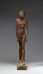 | Keywords: Egyptian - Standing Male Figure - Walters 22211.jpg For a short period during the late Old Kingdom and the 1st Intermediate Period it was popular to show the tomb's owner without clothes These figures represent the deceased in the phase of renewal in front of the god Osiris lord of the underworld This tomb statue depicts a standing nude male with his left food advanced His body is inclined slightly backward perhaps to give the impression of striding Both of his arms are at his sides and both of his hands are closed This is possibly to indicate that he is holding something but we cannot discern exactly what it is as whatever it is does not extend out of his hands on either side His eyebrows are carved in relief and there are lines at the corners of his nose He wears a short haircut leaving his rather large ears uncovered He has a very deeply carved belly button and his toes are carved so as to be completely separated from each other; his fingers are not carved as deeply The rectangular base that he stands on is original and carries the inscription which reads the sole companion Ha'a The body is painted red the nipples black the hair black the eyes black and white and the base is painted black on the sides and red on its top The front of the left foot the left arm the right arm and the body were all made separately and were attached using dowels as can be seen in the case of the right leg The arms are joined at the shoulders The statue is anchored to the base by means of two wooden dowels which go through the base and through an invisible prong located under the right foot In addition to extensive paint loss in numerous places on the surface of this piece this statue has also suffered structural damage Cracks exist down the length of the base's top; a crack in the top of the back end of the base is filled in probably a modern repair In addition the top of the left foot the right shoulder joint and the back of the right hand are damaged between 2236 2150 BC late Old Kingdom-First Intermediate wood with red white and black paint cm 54 11 7 23 ; H with base cm 53 2 accession number 22 211 40432 Dikran Kelekian New York and Paris date and mode of acquistion unknown as 12th Dynasty Assiout Henry Walters city Baltimore Walters Art Museum Henry Walters Acquired by Henry Walters 1914 Translation On base the sole companion Ha'a Carved for Immortality The Walters Art Museum Baltimore 2004-2005 place of origin Meir Egypt Walters Art Museum license Ancient Egyptian statues in the Walters Art Museum Media contributed by the Walters Art Museum needs category review |