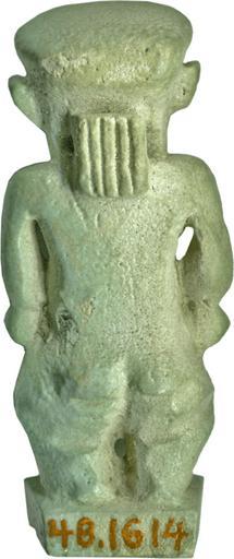 | Keywords: Egyptian - Standing Pataikos - Walters 481614 - Back.jpg This dwarf-like protective deity was very popular in ancient Egypt; amulets in the shape of this god were particularly popular from the Third Intermediate period The Greek name Pataikos comes from a passage in the writings of Herodotus ca 5th century BC who used this term to describe a Phoenician protective dwarf-like image The Egyptian Pataikos is a special manifestation of the creator god Ptah and the dwarf-like appearance symbolizes his magical power This amulet presents the standard type of Pataikos as a standing nude dwarf with his clenched hands at his sides and a large dominating head late 4th-3rd century BC Greco-Roman Egyptian faience with green glaze cm 4 4 1 6 1 15 accession number 48 1614 30653 Maurice Nahman Cairo Henry Walters city Baltimore Walters Art Museum Henry Walters Acquired by Henry Walters 1930 Daily Magic in Ancient Egypt The Walters Art Museum Baltimore 2006-2007 place of origin Egypt Walters Art Museum license Ancient Egyptian amulets in the Walters Art Museum Ancient Egyptian faience in the Walters Art Museum Pataikos |