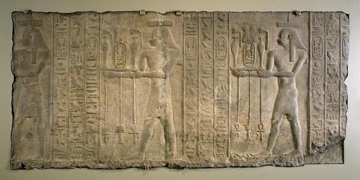 | Keywords: Egyptian - Temple Relief of Nectanebo II - Walters 22119.jpg Once decorating the lower section of an interior temple wall this relief depicts gods carrying offering trays supporting cartouches bearing the name of King Nectanebo II and liquid and floral offerings The deities bring the agricultural wealth of the nome or region they represent in a procession The hieroglyphic texts praise the king and the god Onuris-Shu Unlike the sunk relief used on exterior walls interior walls were decorated with raised relief ca 350 BC Late Period granodiorite cm 84 5 181 6 accession number 22 119 3193 Dikran Kelekian New York and Paris Henry Walters city Baltimore Walters Art Museum Henry Walters Acquired by Henry Walters 1909 place of origin Sebennytos present-day Samannud Egypt Walters Art Museum license Ancient Egyptian reliefs in the Walters Art Museum Sebennytos Nectanebo II Egyptian deities of nomes |