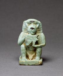 | Keywords: Egyptian - Thoth-Baboon - Walters 481543.jpg The patron of scribes and deity of wisdom Thoth was associated with the sun and the moon traditionally the two eyes of the celestial-god Horus The baboon identified with Thoth here holds a sacred Wedjat-eye the so-called Eye of Horus which symbolizes legitimate kingship the structured universe and life This carefully formed baboon holds the eye in front of his chest with his left hand below and the right above between 664 332 BC Late Period Egyptian faience with light green glaze cm 3 93 2 45 2 53 accession number 48 1543 5829 Henry Walters Baltimore date and mode of acquisition unknown Walters Art Museum Henry Walters Acquired by Henry Walters place of origin Egypt Walters Art Museum license Ancient Egyptian statuettes in the Walters Art Museum Ancient Egyptian faience in the Walters Art Museum Statues of Thoth baboon Thoth amulets Eye of Horus amulet |