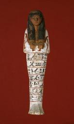 Keywords: Egyptian - Ushabti-Figure of Ka-ha - Walters 22186.jpg A painted wooden ushabti of Ka-ha the Chief of Painters The figure wears a white mummiform garment upon which there is a seven line inscription written in black divided by horizontal lines of red There is a vertical area for text in the back which has been left blank The black paint of the tripartite wig has begun to mineralize and flake off A broad collar is outlined in black and red between the modeled wig lappets The face and hands of the figure are painted red The details of the face including the cosmetic lines of the eyes are accented in black The figure holds two scythes against his chest and two baskets over his shoulders but these are merely painted in red and not modeled in relief The arms although covered in the mummiform shroud are modeled in relief crossed over the chest and the hands are visible This ushabti purchased from the colleagues of tomb artists exhibits superior workmanship ca 1279 1186 BC New Kingdom wood with paint cm 22 5 5 7 4 2 accession number 22 186 10317 Abemayor Cairo Henry Walters city Baltimore Walters Art Musueum 1931 by bequest Acquired by Henry Walters 1930 Translation The Illuminated One Osiris Chief of Painters Ka-ha true of voice he says O' this ushabti if Osiris Chief of Draughtsmen Ka-ha is assembled for any work that is to be done in the necropolis or any unpleasant task is imposed upon him there place of origin Deir el-Medina present-day Western Thebes Egypt Walters Art Museum license Ushabti in the Walters Art Museum Ushabti of the Egyptian New Kingdom