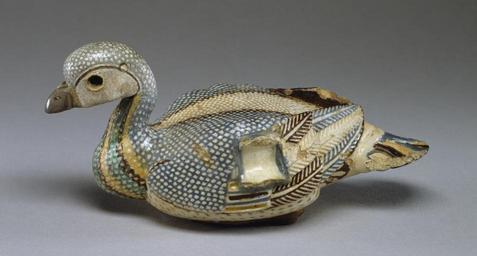 | Keywords: Egyptian - Vase in the Shape of a Duck - Walters 48421 - Profile.jpg Egyptian faience is a composite material composed of ground quartz and natron sodium carbonate and sodium bicarbonate Most faience is glazed in a vivid blue or green color; the polychrome faience seen here is much more complicated to produce The duck was mold-made together with the remains of its ring handle on the bird's left side The surface of the body displays a raised dot pattern while the end of the wings have a feather pattern The form may have been inspired by the red-figure duck vases of Etruria and south Italy The duck is depicted with such detailed naturalism that the underside even has delicately modeled webbed feet century 3 2 BC Greco-Roman faience with polychrome glaze cm 8 5 18 7 95 accession number 48 421 5166 Dikran Kelekian Paris and New York Henry Walters city Baltimore Walters Art Museum Henry Walters Acquired by Henry Walters 1926 From Alexander to Cleopatra Greek Art of the Hellenistic Age The Walters Art Gallery Baltimore 1988-1989 Highlights from the Collection The Walters Art Gallery Baltimore 1998-2001 place of origin Alexandria Egypt Walters Art Museum license Ancient Greek art in the Walters Art Museum Ancient Egyptian art in the Walters Art Museum Works of Greco-Roman Egypt Duck-shaped objects Ancient Egyptian faience in the Walters Art Museum |