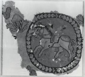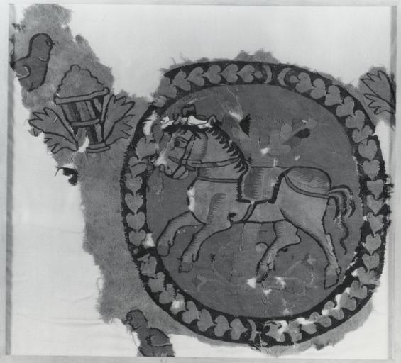 | Keywords: Egyptian - Wall Hanging or Curtain Fragment with Riderless Horse - Walters 83461.jpg This whimsical saddled and fully harnessed but riderless horse was part of a larger curtain or wall hanging of a type popular in the late 5th and early 6th century Curtains and wall hangings were used in private homes as well as in public and religious buildings to prevent drafts divide spaces and provide privacy The tapestry weave of this piece is ideal for such textiles as it produces a design that can be viewed from either side The complete hanging likely would have had many identical roundels one is in the Cleveland Museum of Art in staggered rows on a background interspersed with baskets and birds These designs are traditionally Egyptian while the roundel borders of heart or rose petal chains and the stylized trees are adapted from imported Sassanian silks century 6 Early Byzantine wool cm 41 44 0 1 accession number 83 461 1842 Henry Walters Baltimore date and mode of acquisition unknown Walters Art Museum Henry Walters Acquired by Henry Walters Beyond the Pharaohs Egypt and the Copts in the Second to Seventh Centuries A D Museum of Art Rhode Island School of Design Providence; The Walters Art Gallery Baltimore 1989 place of origin Egypt Walters Art Museum license Byzantine and Early Russian art in the Walters Art Museum Textiles in the Walters Art Museum Byzantine textiles in Egypt Horses in art Silk weaving in Egypt |