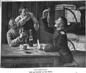 | Keywords: Ein Leckerbissen.jpg de Ein Leckerbissen nach einem Gemälde von Karl Josef Müller 1903 https //archive org/stream/bub_gb_qkAgAQAAMAAJ page/n23/mode/2up Die Gartenlaube 1903 Unbekannt Nach einem Gemälde von Karl Josef Müller other versions PD-old-70 Karl Josef Müller Gartenlaube 1903 German soldiers in art |