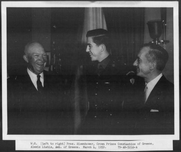 | Keywords: Eisenhower, Constantine and Liatis.jpg Dwight Eisenhower Constantine II of Greece and Alexis Liatis ambassador of Greece Α ό αριστερά ρος δεξιά Ο Πρόεδρος των ΗΠΑ Αϊζενχάουερ o Διάδοχος Κωνστανίνος της Ελλάδας και ο Πρέσβης της Ελλάδος στις ΗΠΑ Αλέξης Λιάτης 1959-03-04 White House PD-USGOV Constantine II of Greece 1959 jpg PD-USGov original upload log el wikipedia MARKELLOS //tools wikimedia de/~magnus/commonshelper php CommonsHelper page el wikipedia CE 91 CE BB CE AD CE BE CE B7 CF 82_ CE 9B CE B9 CE AC CF 84 CE B7 CF 82 JPEG 2008-03-06 15 44 Famape 5852×4898× 2188945 bytes Dwight Eisenhower in 1959 Black and white photographs Constantine II of Greece Ambassadors of Greece Dwight Eisenhower in the Oval Office |